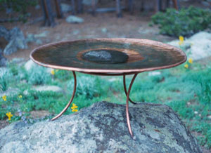 This birdbath was built to be on top of a rock at a mountain home, near the birdfeeder. Copper takes on a natural patina over time. The picture above shows the new birdbath, the picture below shows the birdbath after a few months in use, with a rock in the center. |